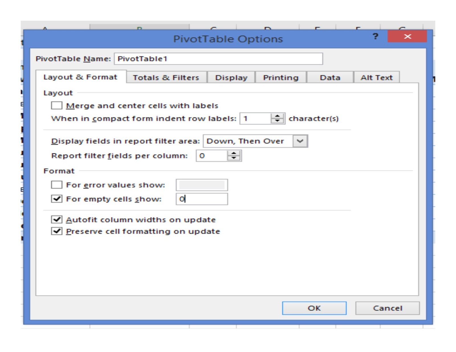 In the pop up window, under Layout and Format tab, go to Format, type "0" into the box next to the field "For empty cells show".